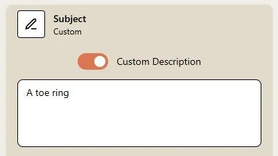 Important: Use the fields correctly. If you want to change clothing or hairstyle, it is crucial that you write it in the corresponding section, not in the jewelry subject.